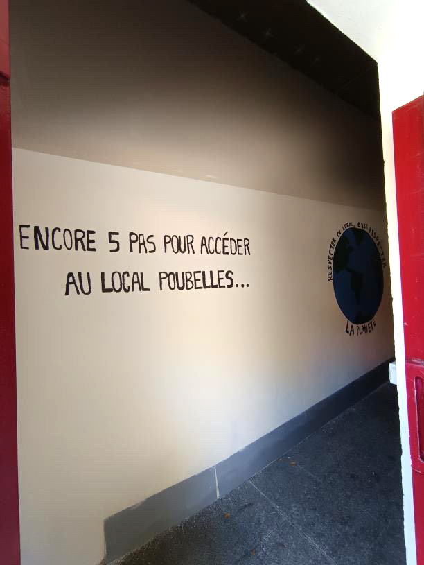 Dans la résidence Abbaye, 4 jeunes ont imaginé et réalisé une fresque et une signalisation dans le couloir menant au local poubelles. Une belle initiative qui apporte couleur et repères aux habitants du site !
